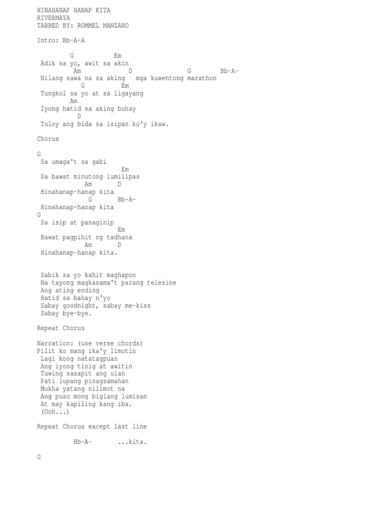 Daniel Padilla - Hinahanap-Hanap Kita chords Comment. Sabik sa yo kahit maghapon Na tayong magkasamat parang telesine Ang ating ending Hatid sa bahay nyo Sabay goodnight sabay me-kiss Sabay bye-bye. HINAHANAP HANAP KITA RIVERMAYA Intro Bb A Verse NC.